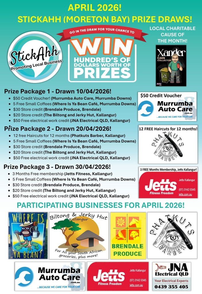 How To Enter Make a purchase from the local, independent businesses for the month of April 2026 scan the StickAhh QR code on your StickAhh label, enter your details, remain subscribed and go into the monthly prize draw. Good luck, and thank you for supporting small business.