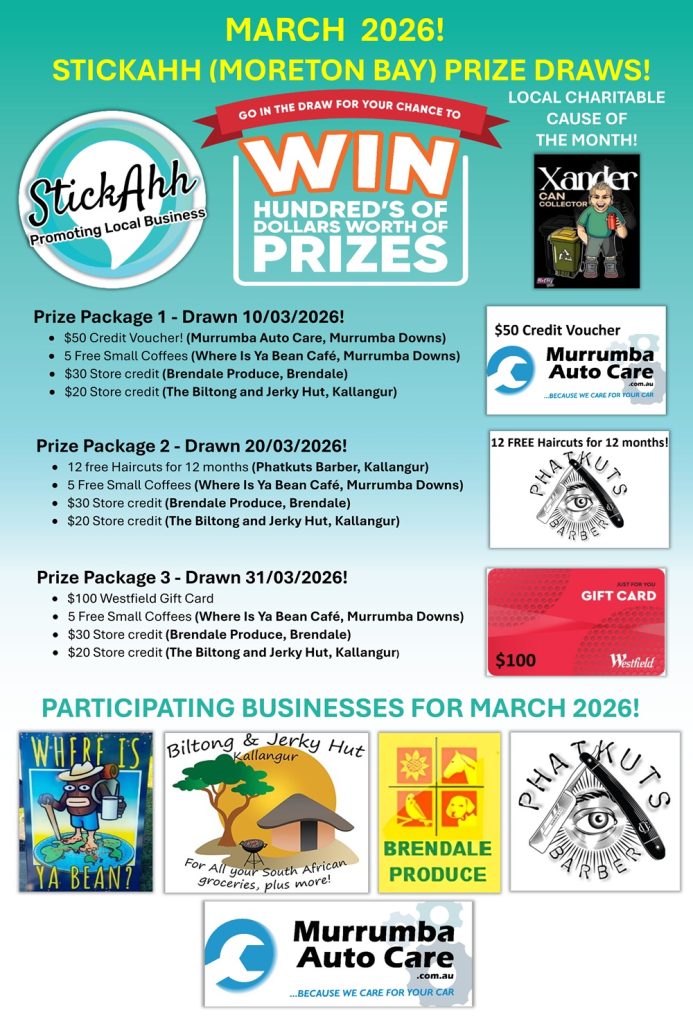 How To Enter Make a purchase from the local, independent businesses for the month of March 2026 scan the StickAhh QR code on your StickAhh label, enter your details, remain subscribed and go into the monthly prize draw. Good luck, and thank you for supporting small business.
